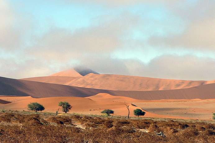 Im Westen wird die Namib von einer Bergkette begrenzt, dem Great Escarpement in Nord-Süd-Ausrichtung. Das Khomas-Hochland ist Teil der Randstufe, die den letzten Regen abfängt, der fast immer vom Indischen Ozean im Osten kommt. Windhoek, wo fast alle Nambia Reisen beginnen, liegt dort und hat auf 1800 Metern Höhe ein angenehmes Klima. In Norden - nördlich von Omaruru - reicht die Randstufe näher an den Atlantik heran.